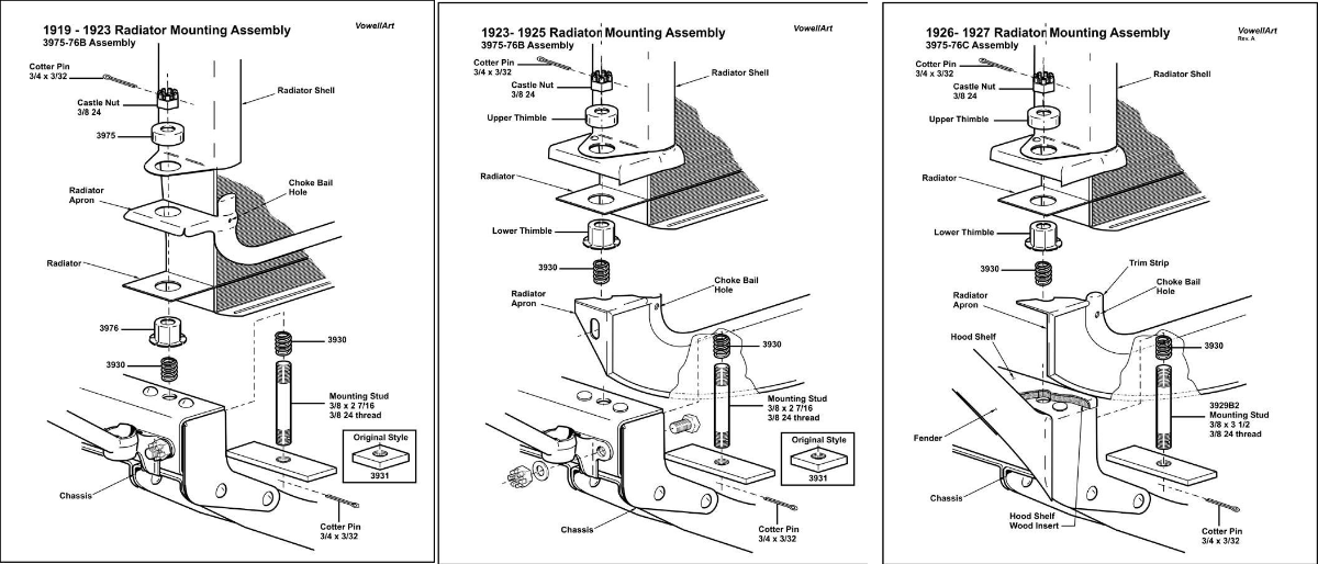 Pre. '26-'27 frames will sag more than the "improved". Adjustment is needed at the top end, so that the upper radiator hose will have to be replaced after the hood rod from the radiator to the cowl is screwed out to lengthen space to fit hinged hood.