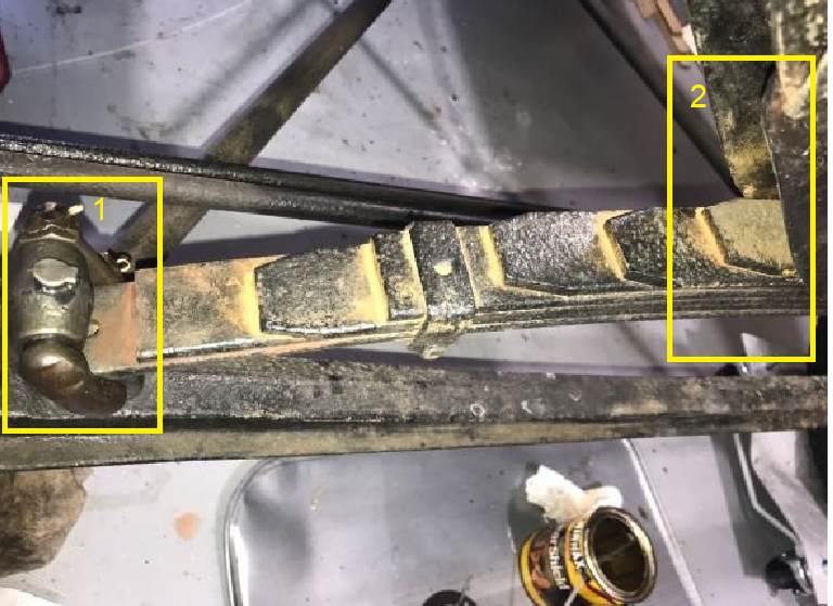 That spring appears to have had a long, hard life, and it shows evidence of having been rebuilt before. Probably long before. I'd consider replacing it. The crossmember needs to be in good condition and tightly rivited to the frame side rails.