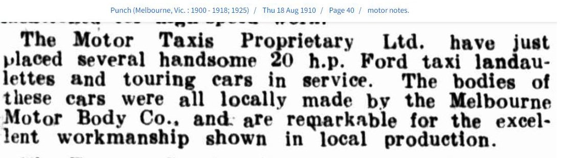 One mention in February 1911 says chassis to suit single seater bodies will be arriving next week. Obviously if they were arriving in Feb 1911 they would have been sent from Canada in late 1910. In mid 1910 A Melbourne firm ordered "several" Landaulettes for their Taxi business. The Town Car body was not only large it was expensive and required a huge box to transport it. Making the body locally probably saved them quite a deal of money.