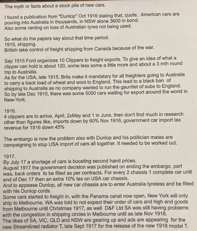 Yes, that was some interesting reading back in 2010. That article that Arthur Davies wrote in 1925 claiming the Australia had 5000 unsold T's always played on my mind so several years ago I did some digging on that claim but more so in shipping and politics of that time frame of 15/16/17. More paper work than I care to re-research but I did post a basic summary at that time. My conclusion was that Davies didn't have his facts correct.