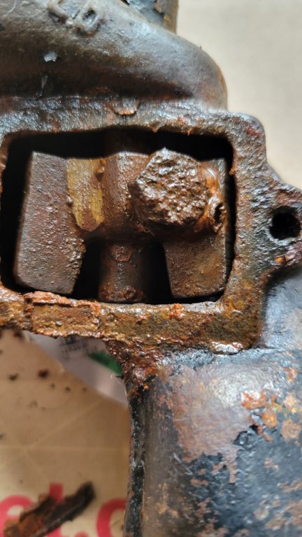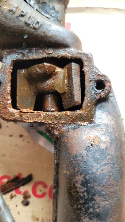It appears to have been broken and brazed back together. Also, seems to have an oversized bolt to lock it to the shaft.
