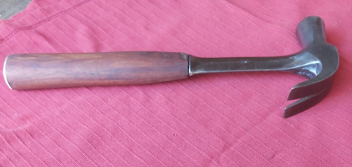 I bought box of junk tools at an auction recently, just for a couple of forged steel G clamps. Buried in the bottom of the box was an Eastwood forged claw hammer, minus half the leather handle and the remainder wrapped in heaps of black insulating tape.