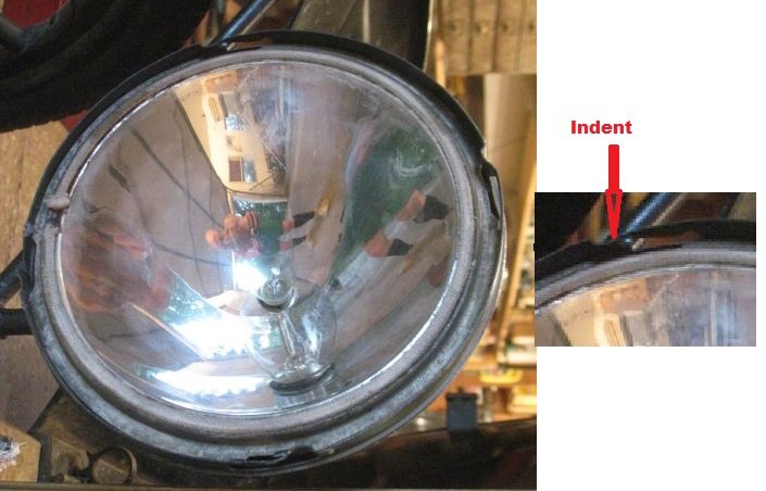 take a close look at Frank's picture of an "indent". You will notice that the entire perimeter of the bucket's rim is the same diameter with the exception of the 'pooched-in' section that clears the pin(s) on the rim. By design, there is a slanted slot that the pin follows along while being twisted, slowly drawing it in until it "clicks" into place. Very often that long poorly supported bit of metal is bent inward from crashing into the rim's pin. This will keep the reflector from seating. If you look around the vast majority of your bucket, your reflector appears to want to just drop in and the only interference is along the four areas where the bucket is bent in from lack of support. If this is the case, just use your thumbs to bring the ENTIRE perimiter of the bucket to the same diameter and you will find that the reflector will drop in.