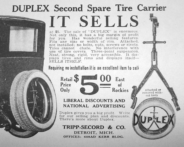 Interesting, thanks for clearing that up Frank! I was hoping it would attach to the side of the car, since I have a ‘16 touring with Demountable’s and I don’t have the rear tire carrier. And one won’t work on this car because of the tail lamp location. What I really need is the carrier below the Duplex ad you attached, that mounts to the running board! Anyone have one by chance???