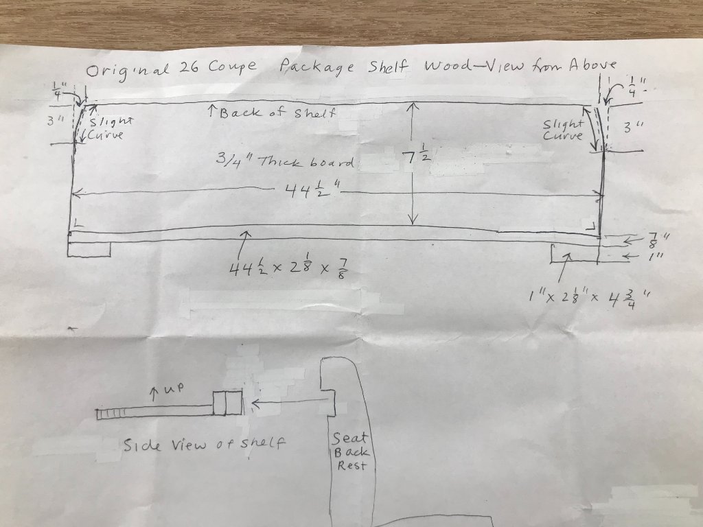 You do have a 26-27 coupe. Even though you may have a title that says 26, or a motor block with a 26 serial number, it is my understanding that most, if not all 27's had no wood around the windows, but 26 coupes did. My coupe is a 27 with no wood (except for the roof. The seat springs should be available from Snyder's or Lang's. They do have some wood attached to the springs. If the wood is not available from vendors, you may find pictures previously posted on this forum. I have an extra metal package tray if you need it; just pay freight, either by USPS or Fedex.