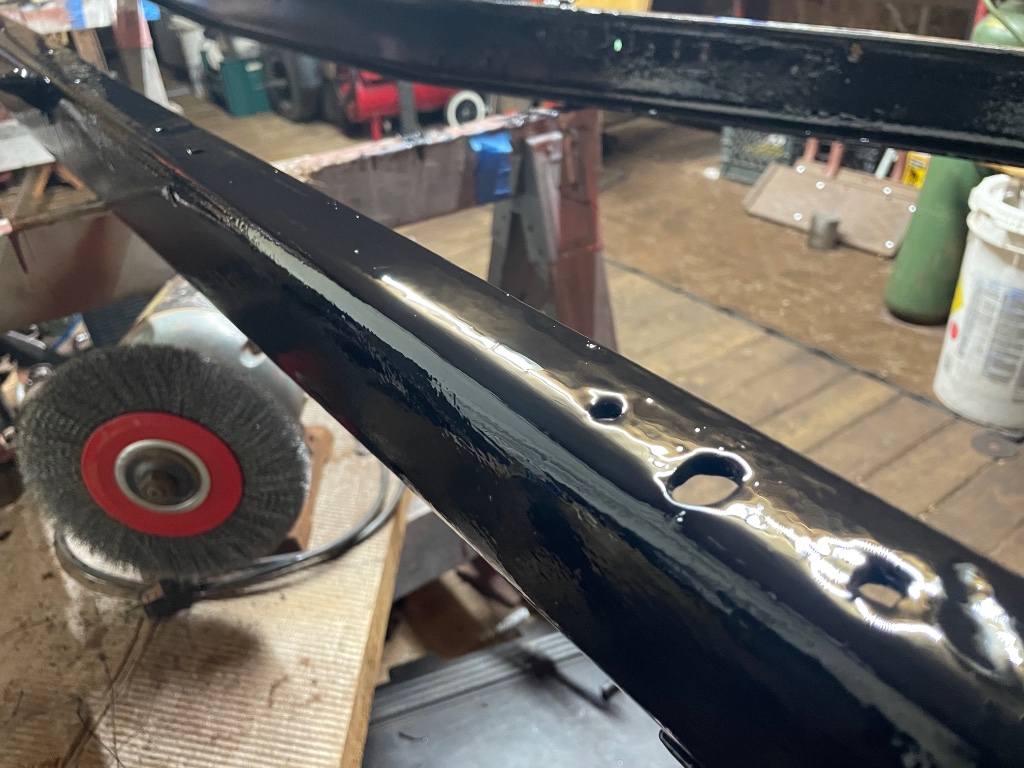 Still healing up from a full hip replacement in late Dec but I have been trying to pick away at the TT as pain allows. Today I managed to finish riveting the replacement correct front crossmember. It took me several hours to make the different back-up bucks that fit tight between the rivet head and opposite frame flange. I had to do this as I work alone. I brush painted the entire frame using RustOleum gloss black with the TSC enamel hardener catalyst. I am anxious to see how it drys now as this is the first time I have used that hardener. I am excited to start hanging parts now!