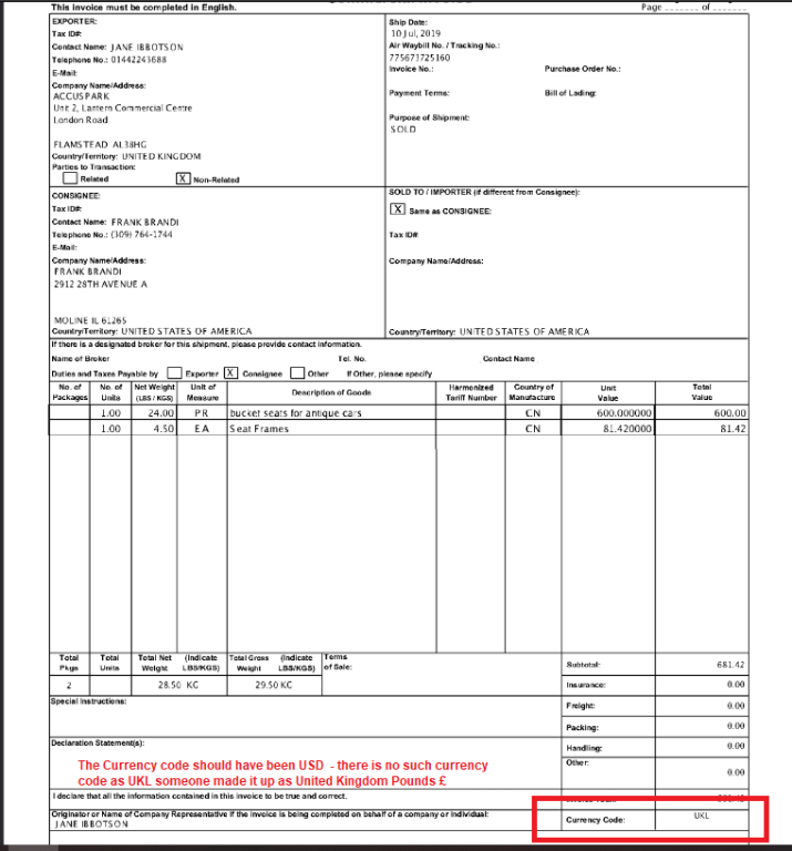 The Commercial Invoice stated a non existent currency code UKL instead of USD. Then FedEx assumed it was GBP when filling out the Import Declaration it took me a full year for FedEx to understand their error and refund me the difference. I was told that the $800 de minimis threshold didn't apply because the Country of Origin was China. Not sure if that was true but the person who finally got me my refund seemed to know what was correct. Doesn't matter and no further discussion need on it. Just need to understand Blockley Imports