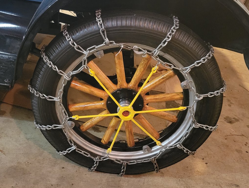 A side note on chains - they need to be installed loose enough to "crawl" around the circumference of the tire when in motion. Too tight, and the cross chains will cut across the tire tread where they sit. Another aspect, chains limit one's speed to 25-30 mph, not an issue for a Model T, or when you really need them, but annoys other drivers if you have to go any distance on bare pavement.