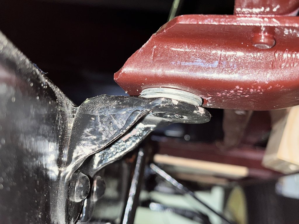 I raised the body enough to get the bolts into the bracket (photos 1 and 2). This has required two washers on the left front frame support bracket (photos 3 and 4), and one washer on the adjacent body block (photo 5). In my next post, I will show how the body is setting now.