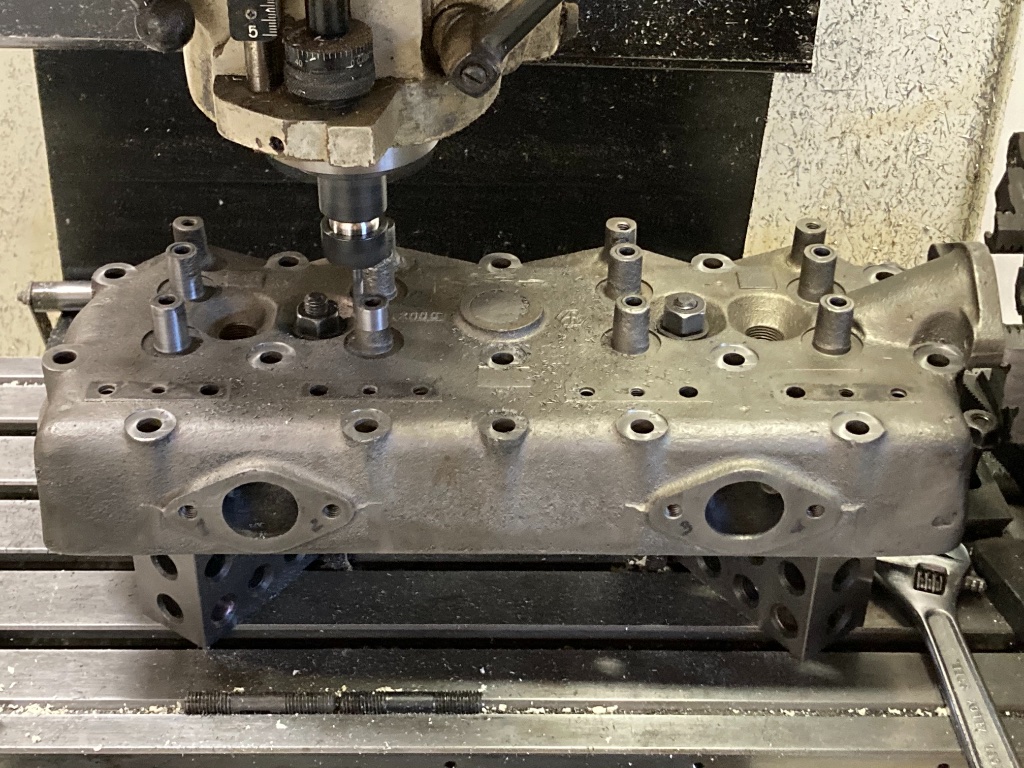 Got the bolt bosses faced to a common height so that the rocker sub plate doesn’t get twisted when torqued down. Also the valve guide bosses were trimmed to clear the stock T springs. Made spacers to shim the springs to the correct compression height. Drilled and reamed the epoxy plugs for new push rod guides. And started turning the new bronze push rod guides. Will need to sand and blend the epoxy plugs to match the port floors prior to pressing in the push rod guides
