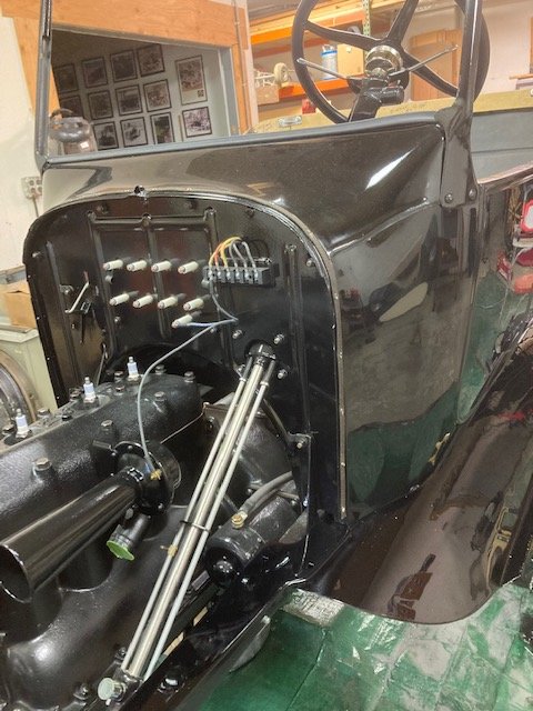 Installed the steering column and steering wheel in my 25 project today. Starting to look like a car now. There is a good section in the Encyclopedia about spark and throttle rod painting and whether or not to paint the lower part of the column beneath the hood if you are detail oriented. Says the rods should be painted and the column left alone. Looks like I am partly breaking from tradition.