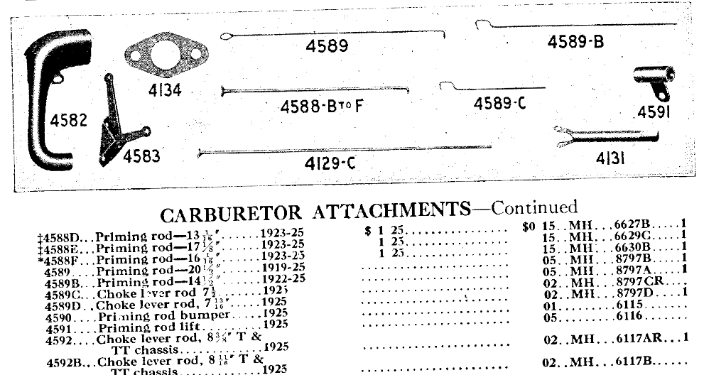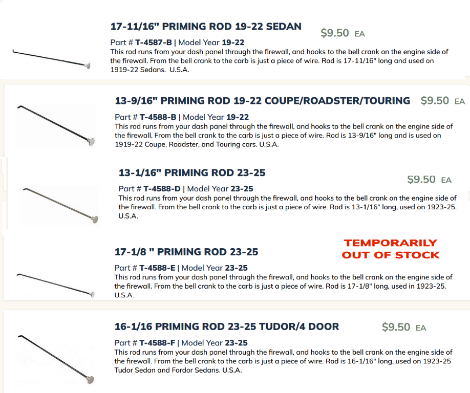 T-4588 Priming Rod, not T-4431 Carburetor Priming Rod (wire). The Priming Rod that was bought as a replacement from the vendors does not match any of the lengths listed in the Parts Price List for any of the Priming Rods, for any year/model, no matter what way/configuration you measure it. The closest it gets is to T-4588-B (1/2 inch too long) or T-4589-B (1/2 inch too short). Not to mention, the hole for the cotter pin is so far inboard to the bend its useless. I need to know what way they measure/measured the lengths listed in the Price List so I can make one the right length.