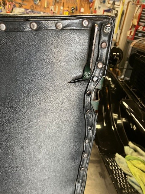 The interior door panel on my 1923 runabout is falling apart from use. As most of you know it’s a dense black cardstock base covered with a thin textured outer paper skin very much like that used in musical instrument cases, camera bodies etc. There is a oval cutout relief near the lock assembly that is trimmed with a thin steel edge. My question is … was there a similar steel edge on the oval hole for the release? Does anyone have a complete panel in good condition as a reference?