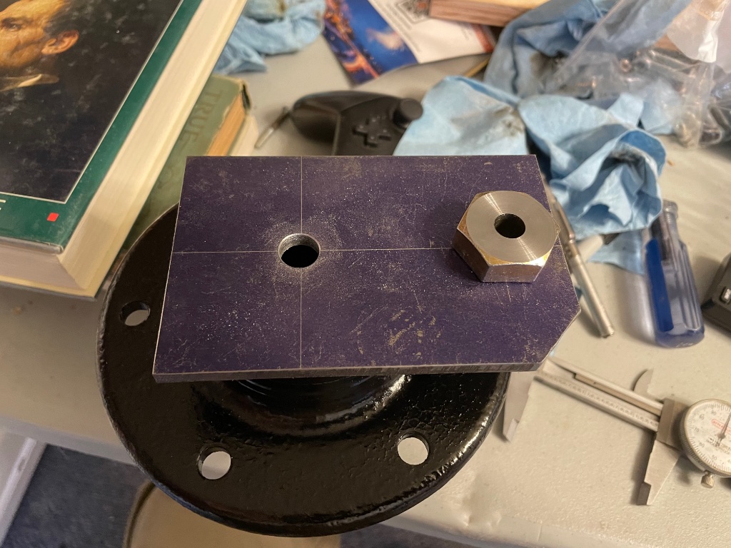 Another angle of the drilling jig. It was held on by a 7 inch long 1/2 bolt through the hub.