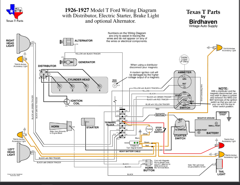 It is a mutt 1911 Model T Runabout. The previous owner had installed the alternator, starter, lights, distributor and coil...all 12 volts...but no wiring...this is what I need help on. Am not good at electrical wiring on the fly without seeing a diagram compatible with this setup. I need a visual guide.