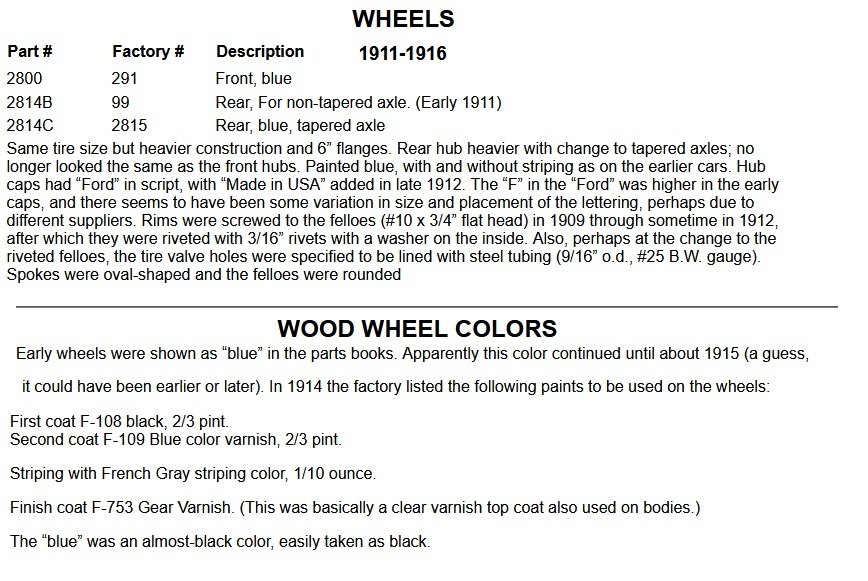 The thing was, that in those days fifty to seventy years ago? People were finding original cars in barns and garages that had natural finished wheels. So they knew they were around much earlier. They just did not know whether natural finish was a factory thing or something else? Research and talking with the people that had been there and done that found it out. 1913 through 1925 model t fords all left the factory with black painted wheels! Natural finish was an after-market change.