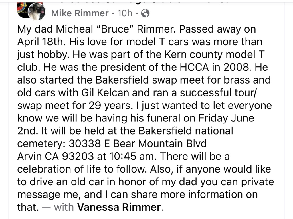 Re: Michael “ Bruce “ Rimmer Has Passed Away - CoFounder Of The Bakersfield Swap Meet