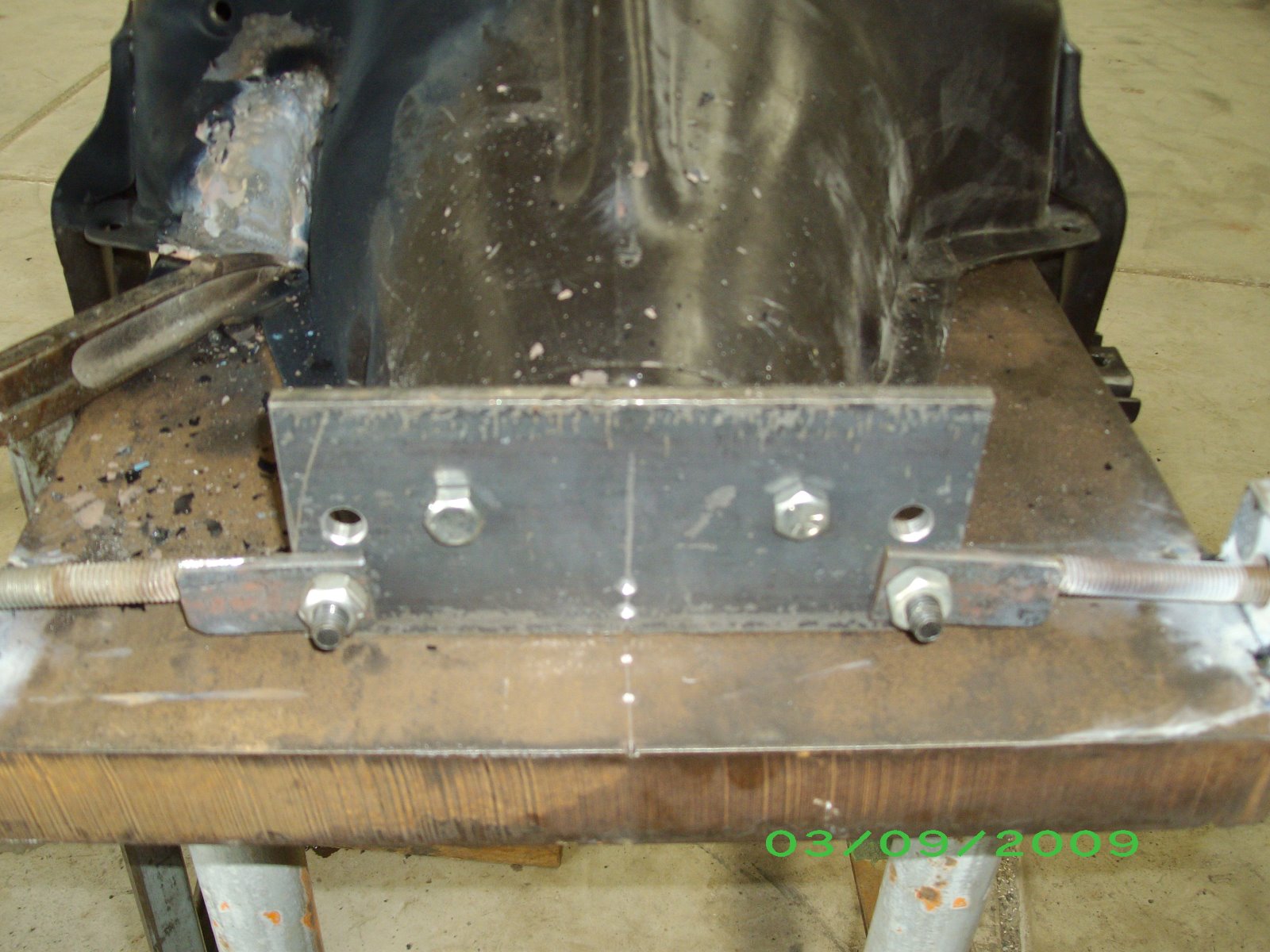 Get two large angle irons - 3 or 4 inch and longer than the engine and transmission. Bolt the angle irons to the top of a '26 or 27 block and turn it upside down. Bolt the hogshead to the block. Put a straight edge to make sure the pan surface on the block and hogshead are straight. Use a straight edge of some sort to make sure the block mains are true to the forth main on the back of the hogshead. You'll probably want to make some jigs to help out. Oh yeah, run a couple of heavy straps or some such things up from the angle irons to the forth main on the hogs head to stiffen it up and make sure it doesn't move.