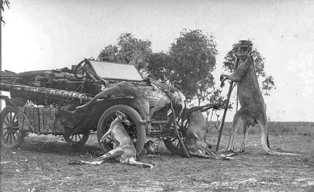 The photo with the kangaroos, it looks like a big bird over the hood and radiator.