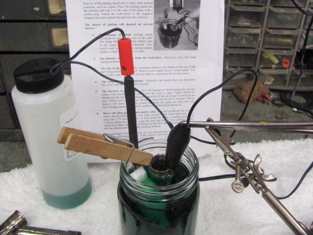 All you need is one gallon of vinegar, a little salt and about $25 worth of nickel you can get on eBay. I used a 6-12v 10 amp battery charger for a power source. You can make as much of the solution you want for cheap instead of buying it and pour it into any container you want to fit your parts. You just hang a piece of nickel from each side of a container filled with vinegar and a little salt, then hook electricity to each one. The solution is ready when it turns blue-green. Then remove the strip from the ground side and attach the ground to the part you intend to plate by a copper wire used to hang the part in the solution. Leave the positive connected to the nickel strip. It helps to move it around. I pour the solution back into the vinegar bottle for next time.