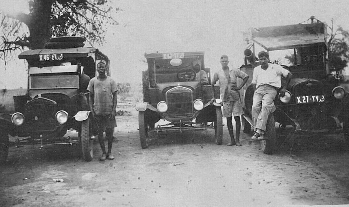 In the first photo of two Fords and a Chevrolet, the foreign markings on the vehicles and the appearance of the folks suggest possibly north Africa.