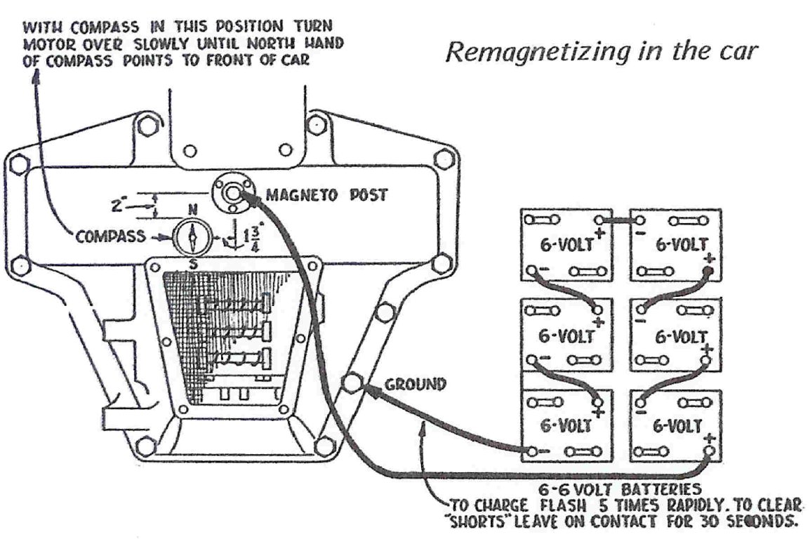 Jim, if you decide to do an in-car magneto re-magnetizing, the drawing that Robert posted is very helpful. But search the forum posts for the specific procedure to ensure success. Just connecting wires as shown will not work. Also, that drawing is old and deceiving. The centerline of the compass should be 1 ¾” to the left of the post, not the edge of the compass.