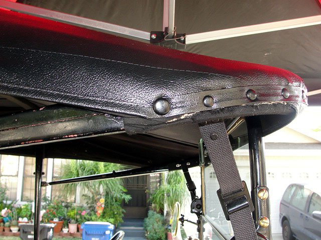 Ignacio, You rear curtain and front straps should be woven web straps, not leather. The woven webs don't have buckles like leathers do, they've got slip buckles sort of like web belts for pants have and they're easier to adjust. I didn't bother to drill out the rivets on mine, I just cut the strap high up near those rivets, so that I had most of the material hanging below the tack rail, so I could really mount it with good sturdy nails (these straps on the back take the stress off the rear curtain when you erect your top, the front ones pull forward and the rear ones keeps the stress of the curtain and place it onto the straps).