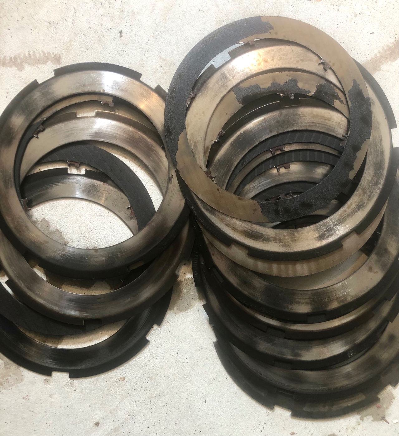 Appears in the photo that that set of worn modified Turbo 400 discs are the lower performance type (i.e. lower cost discs) because they show a "in - line' groove facing, friction material. Think perhaps the liner steel for the circular tabs could have been poor heat treat or something to wear that way?