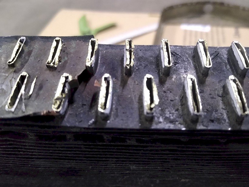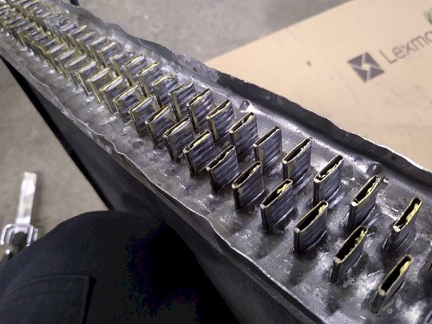 Pealing away the layers. The flat tubes are brass and the fins are copper.