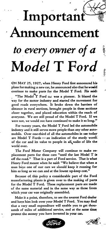 I found that the library in the small NW Ohio town that I grew up has an online search capability of the town newspaper going back to 1922. Today I searched "Model T" to see what I could find, and saw this ad from March 1928 placed by Ford assuring Model T owners that Ford would still make parts for their cars "until the last Model T is off the road".