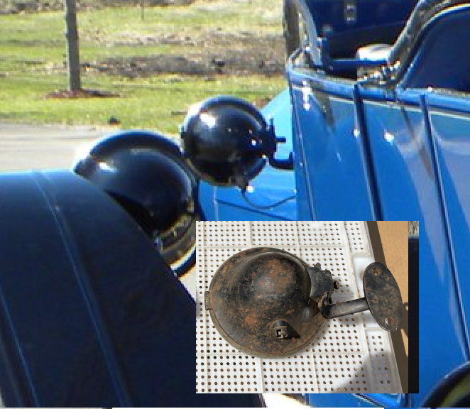 Some pictures of a 1914 Overland's side lights. The shaped looked good : hinge, socket & bracket location. But the profile shot. shot shows a more elongated bucket. The mounting is also different. Still could be an Overland but different year