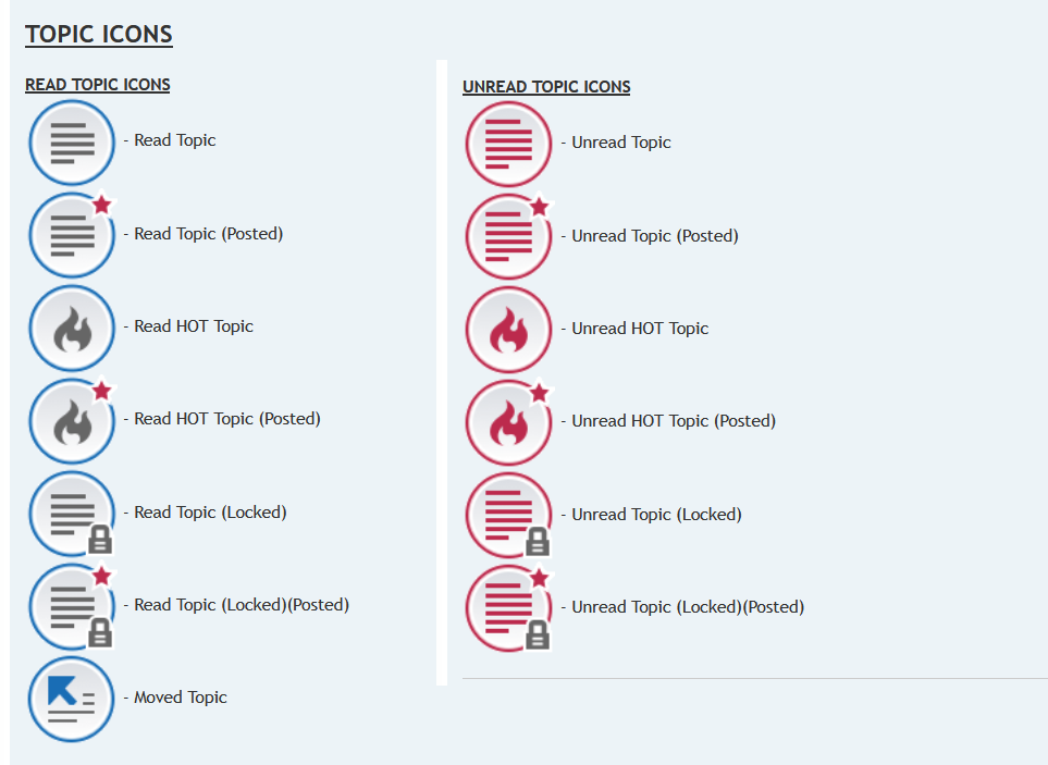 Post icons have meaning will add later but you can see that some are defined below like the fire for a hot topic and ! for a sticky topoic