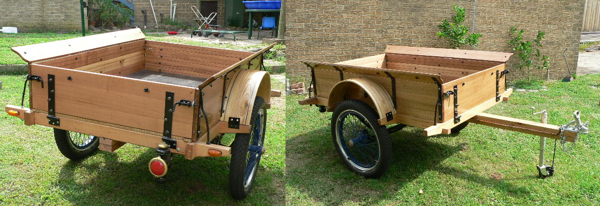 This afternoon I met a person who lives nearby me and he has this trailer from his grandfather. He told me that the family used to have a farm just outside of town and his grandfather would use this to cart produce to the town's farmer's market. He believes it was a kit at the time, maybe from Sears?, where you have to provide your own axle. It has a T rear axle underneath. It seems to be in nice shape. It has modern 12v lights on it.