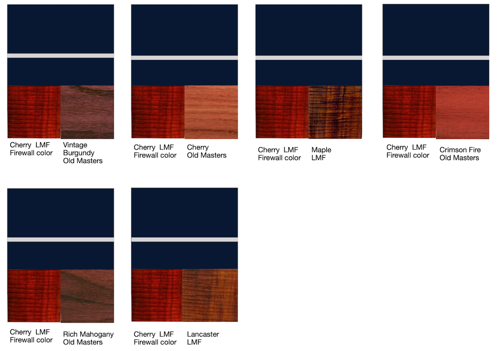 Cherry LMF and Crimson Fire is most appealing to me. Are your sing oil based stain or water based stain? Water based is the best for bringing out the different layers of the grain but you need to dampen the wood first, let it dry, then before applying the stain, lightly sand off the standing grain, as water causes the grain to stand up. Jim Patrick