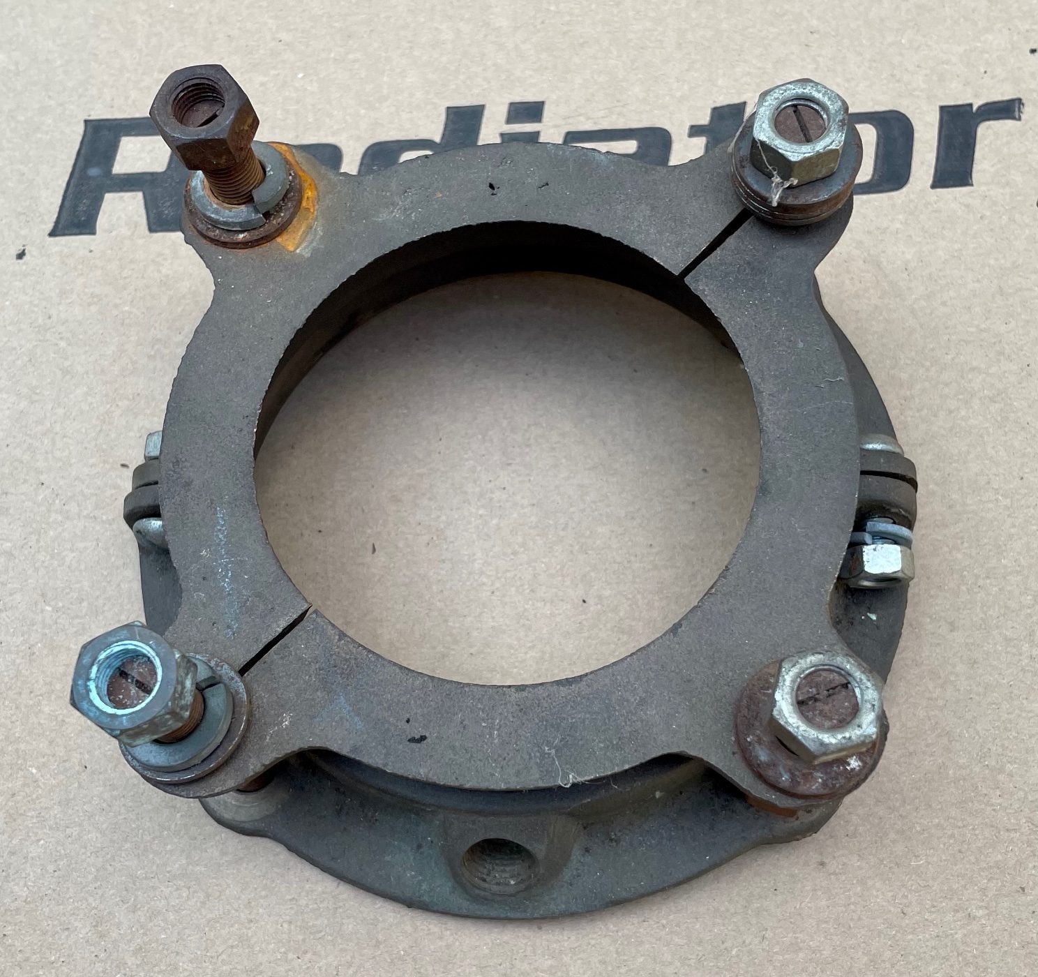 Bill Rader (Vintage Authentic Reproductions) sold these many years ago as an accessory adjustable clamp to tighten up a loose ball joint/4th main fit. It replaced the stamped driveshaft housing flange.
