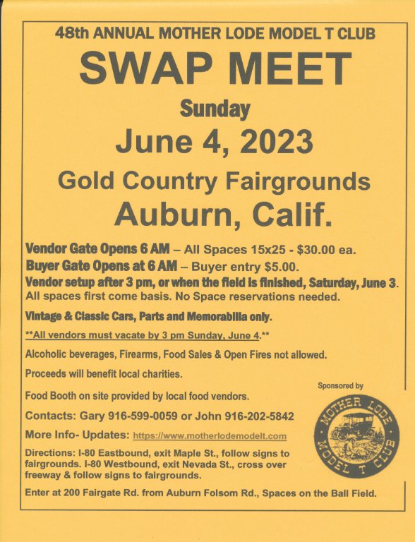 The Auburn Swap Meet is scheduled for the first Sunday in June, that would be June 4th this year, with a move in day of Saturday June 3rd. I received a phone call from Erik and Michael about an hour ago. They'd like us all to "converge" on Auburn this June!! It isn't a strictly pre-war swap meet, but it is hosted by The Mother Lode Chapter of the MTFCA. I realize not everybody will be able to be there, but it is a chance to look at some "rusty iron". Dena and I are going to be working this entire year to make the Tulare meet for 2024 even better than what we planned for this year.