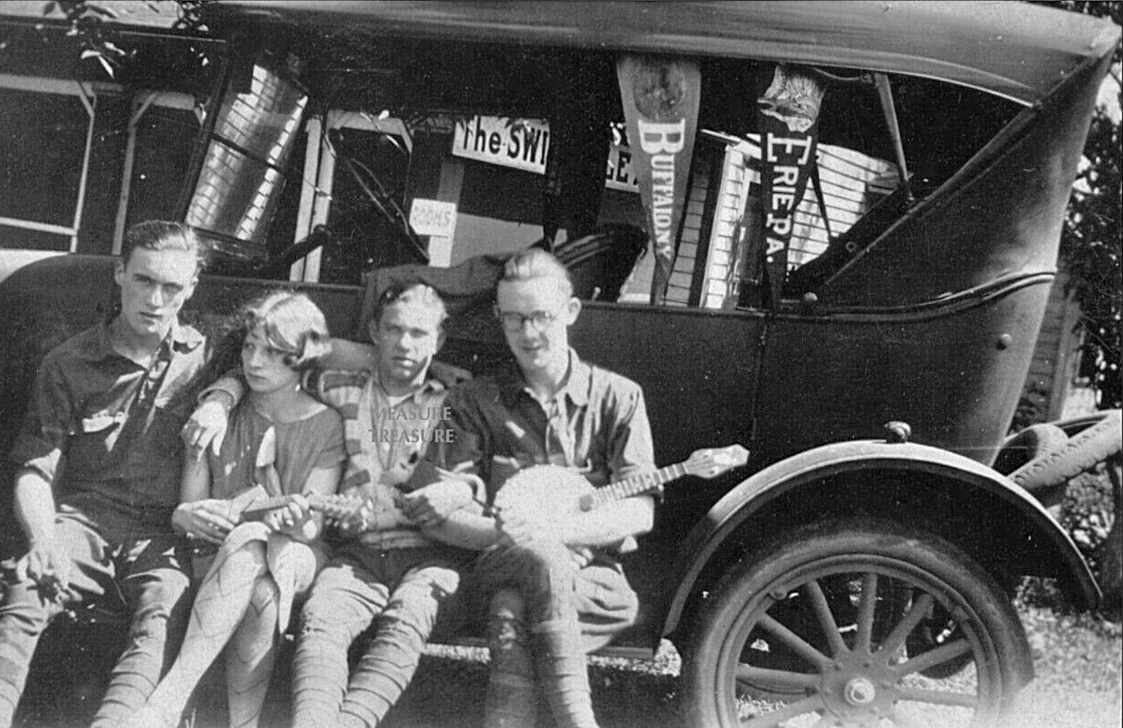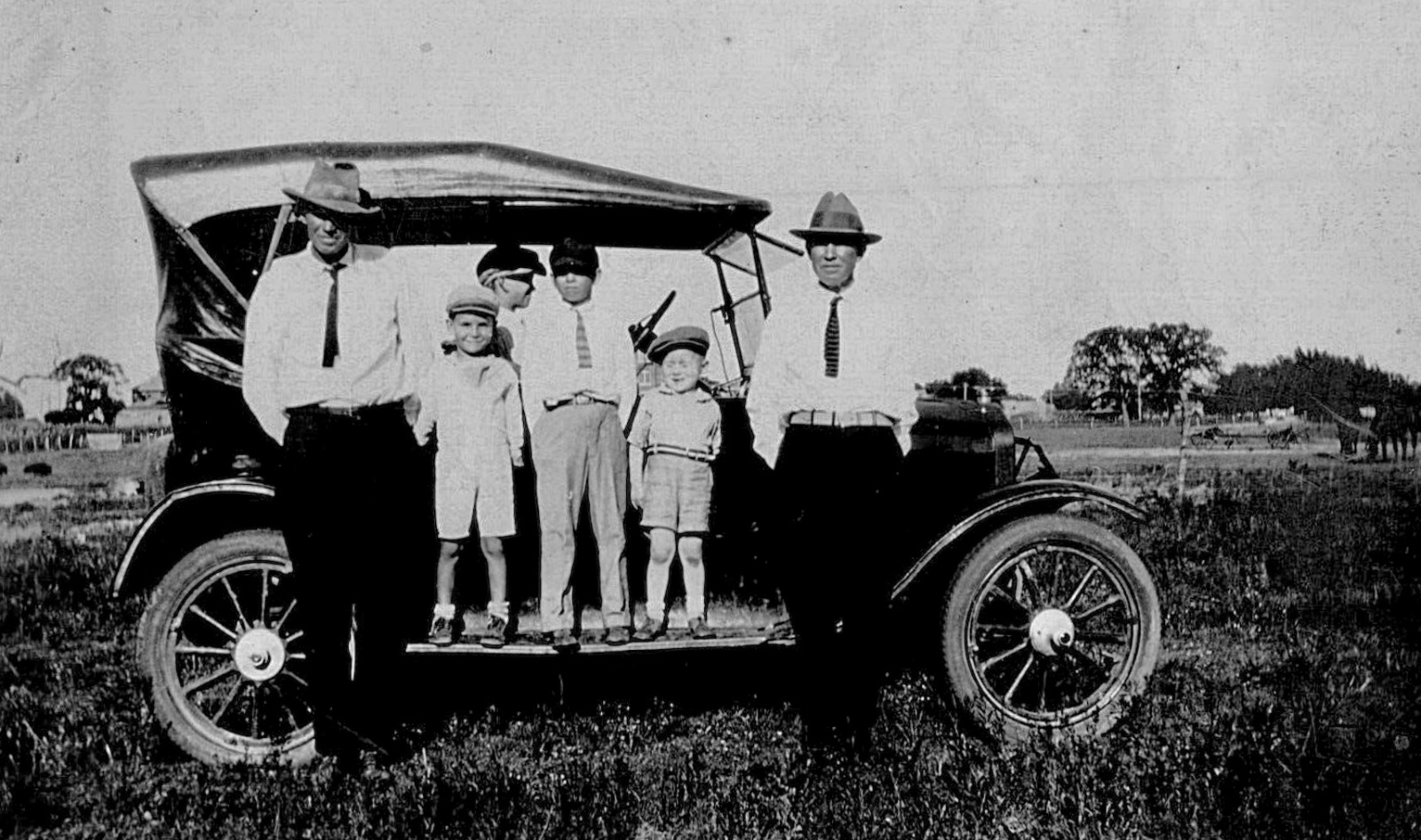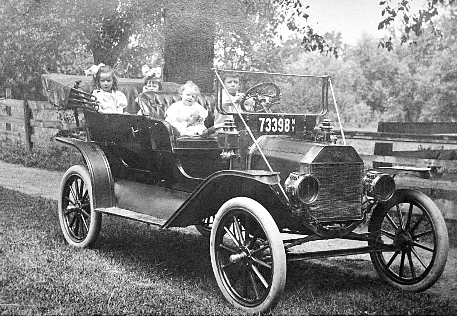 Picture number five, the truck with all the kids on it, is particularly interesting. It appears to be some unusual early form-a-truck. The horn button coupled with the fenders suggest it is likely a 1917. The rear wheels and springs being huge and longitudinal suggest that it is quite heavy duty. However, what can be seen of the differential housing suggest maybe otherwise. I wonder if it is a solid axle with the wheels on it, and a smaller driving differential running through a cogwheel gear arrangement?