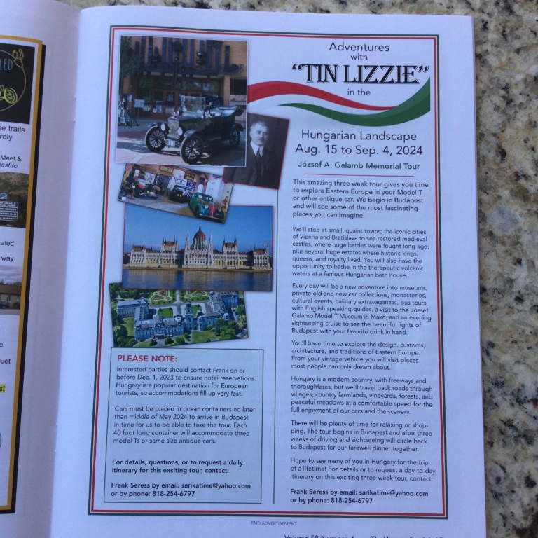This is the advertisement in the Vintage magazine, please look it over and make your intentions known. Just came back from Europe, Hungary and drove the tour route and it will be a wonderful trip with your own model T or antique car.