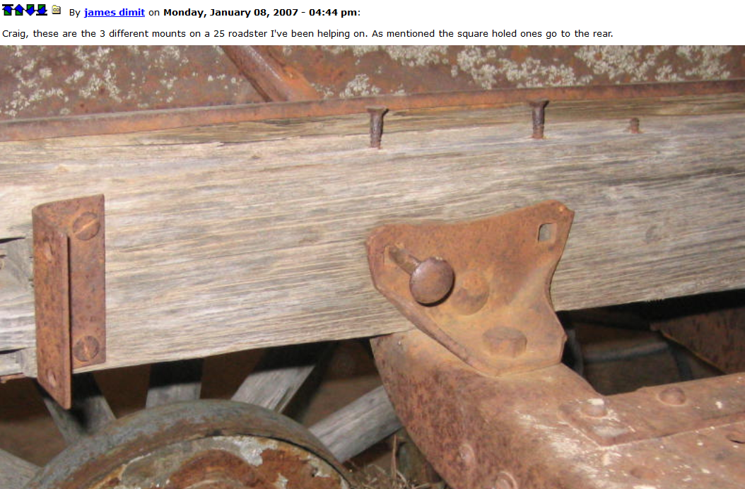Craig, these are the 3 different mounts on a 25 roadster I've been helping on. As mentioned the square holed ones go to the rear.