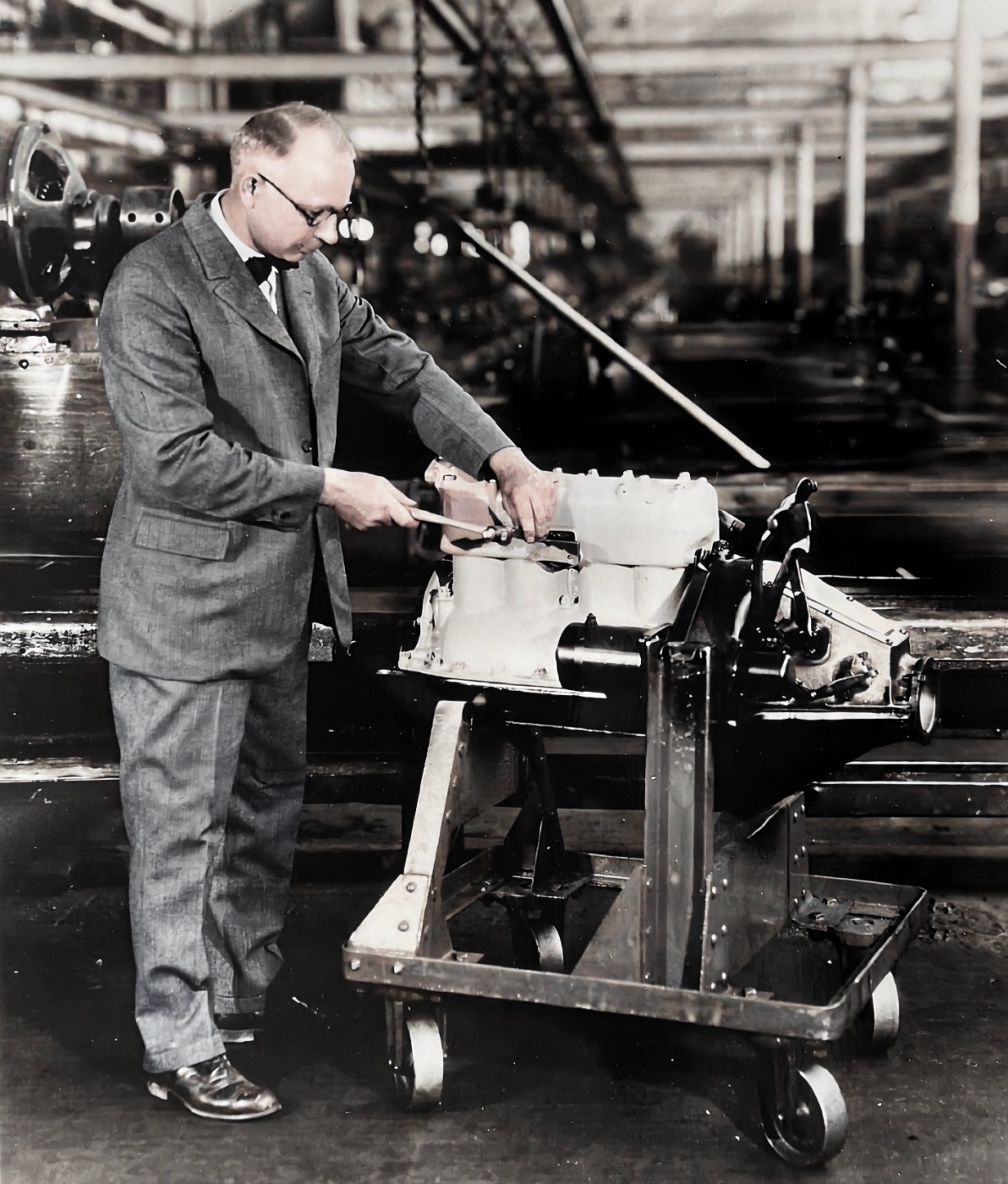 Below, Frank Kulick stamping the 15 millionth Model T motor in 1927: