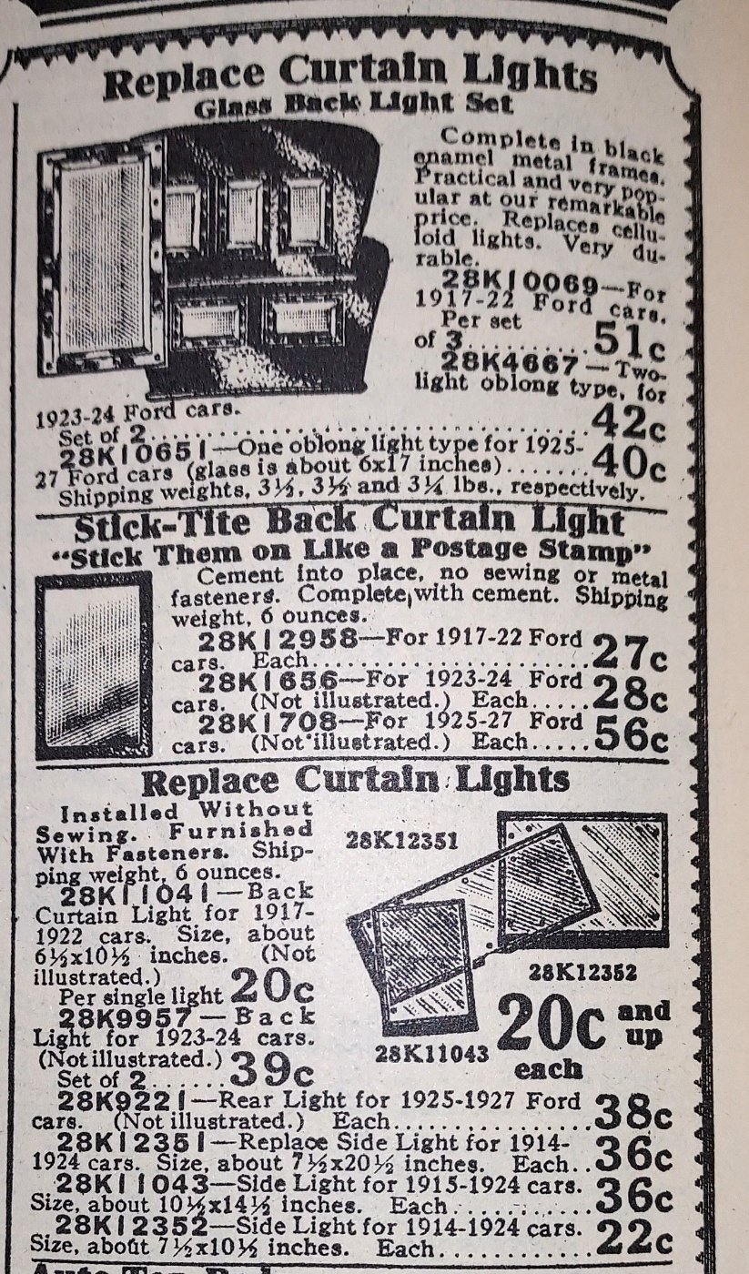 I agree with Erik. This is my original 1924, the rear plastic windows had been replaced sometime in its life with accessory glass windows. In my case the rear window outlasted the top. The metal frames with glass are available NOS at many swap meets, Ebay, etc., and come in different sizes for the various window configuration changes for the model T body changes.