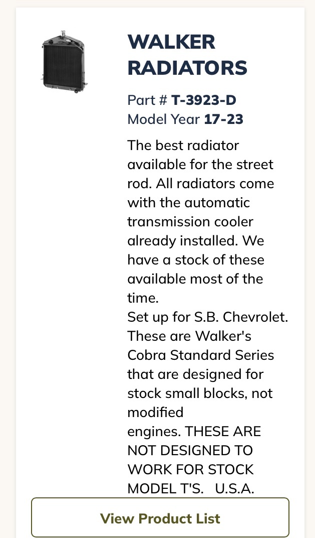 Jim, I think you are confused in this. To my knowledge, after Walker sold to Johnsons, they are only manufacturing street rod radiators. They do manufacture Model-T radiators however they are for street rods.