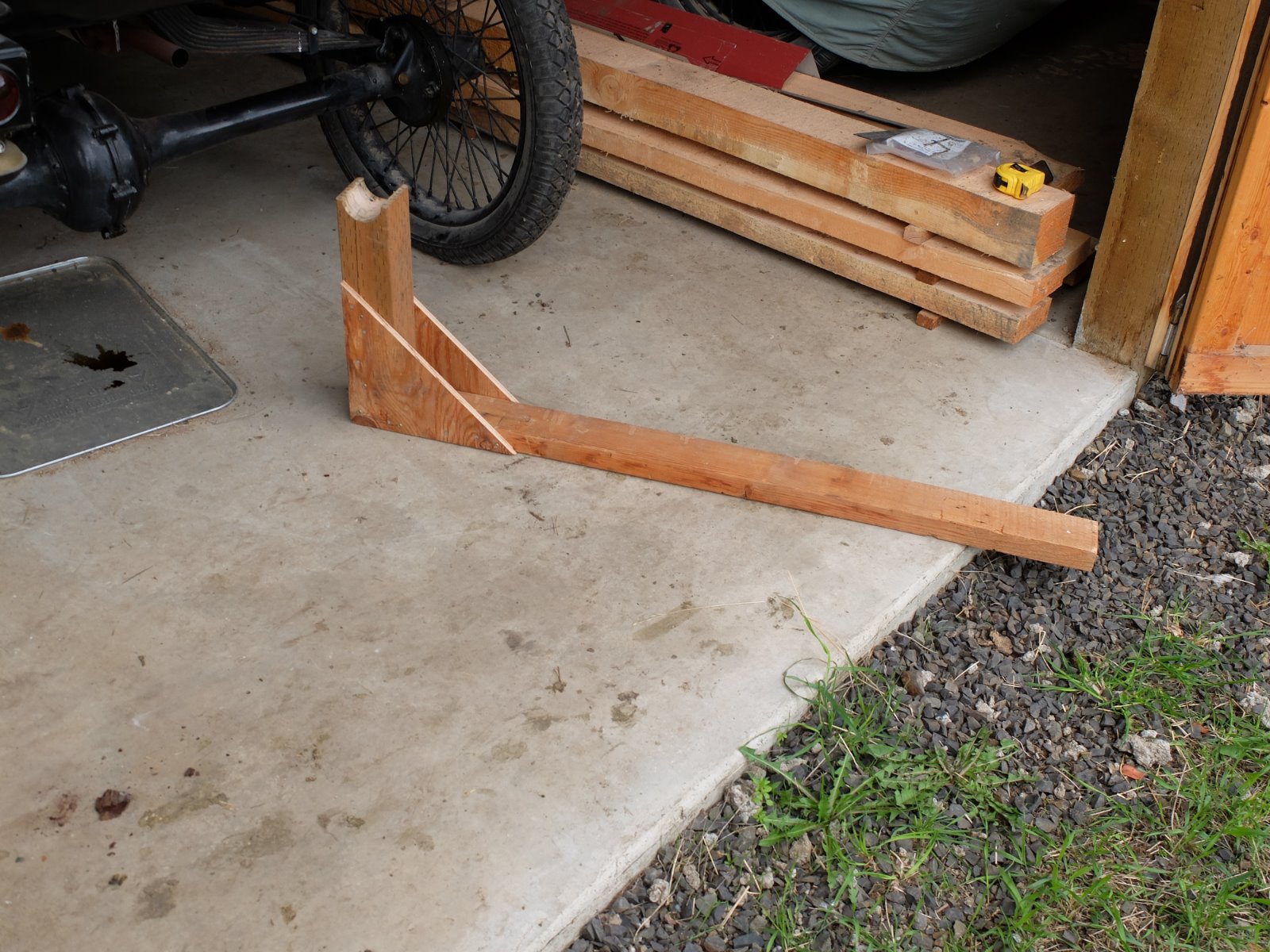 I started my 14 for the first time this year yesterday, and since it was cool I couldn't get it started normally so I resorted to jacking up a rear wheel and got it started OK. It's a pain having to jack it up so today I decided to try to build a simple axle lifter to do the job easier. This is what I came up with.