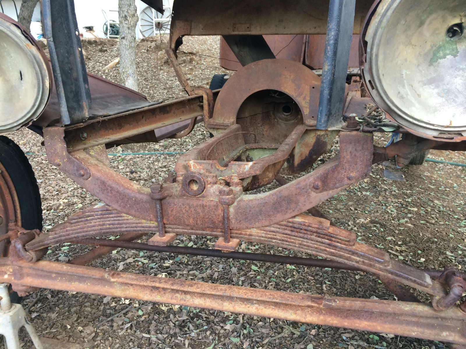 You got it! I had a friend contact me and ask if I would get this out of their yard because they were clearing the space for building. It was used as a vineyard wagon. I noticed both front and back had added leaf springs. I added sheet parts to make it into yard art. It also had a draw bar to connect it to the tractor. It was interesting in that it was designed to actually turn the front wheels. I keep that to use when I need to tow my T;) (Yeah I know that would be a bad idea.
