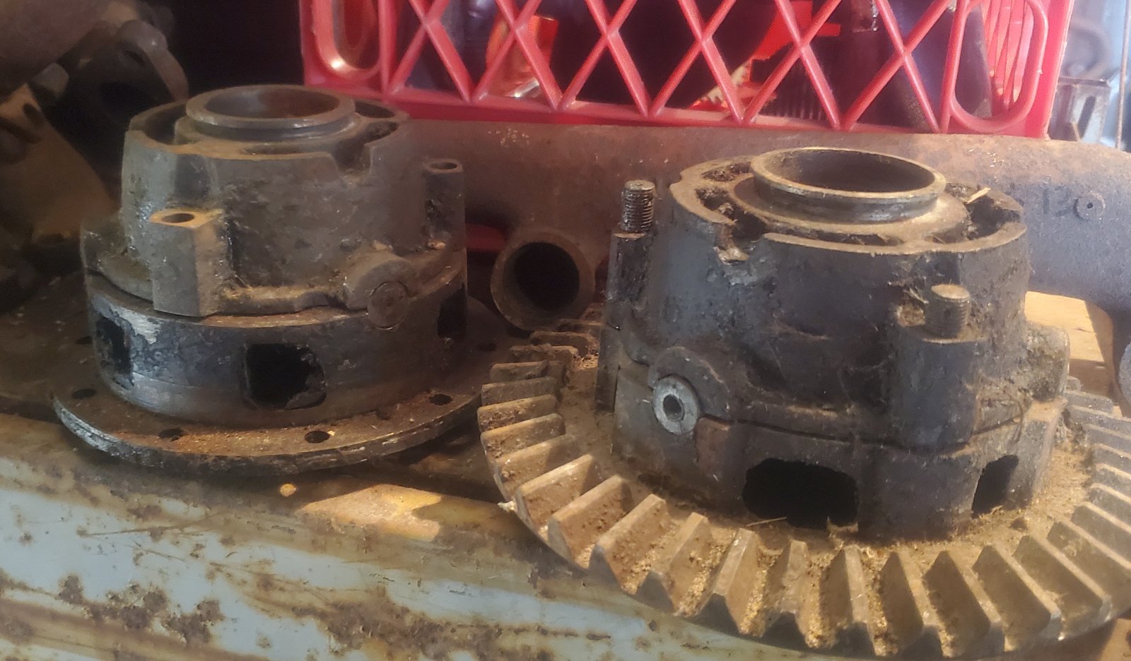The lip that the thrust washers ride in is really worn and undercut on both. The thrust washer would have been held in place with two pins. Looks like the pins sheared, allowing the steel thrust washers to cut into the flange.