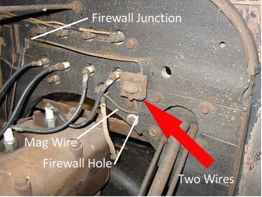 There's a hole in the firewall, for the magneto wire to go in and the two light wires to come out.