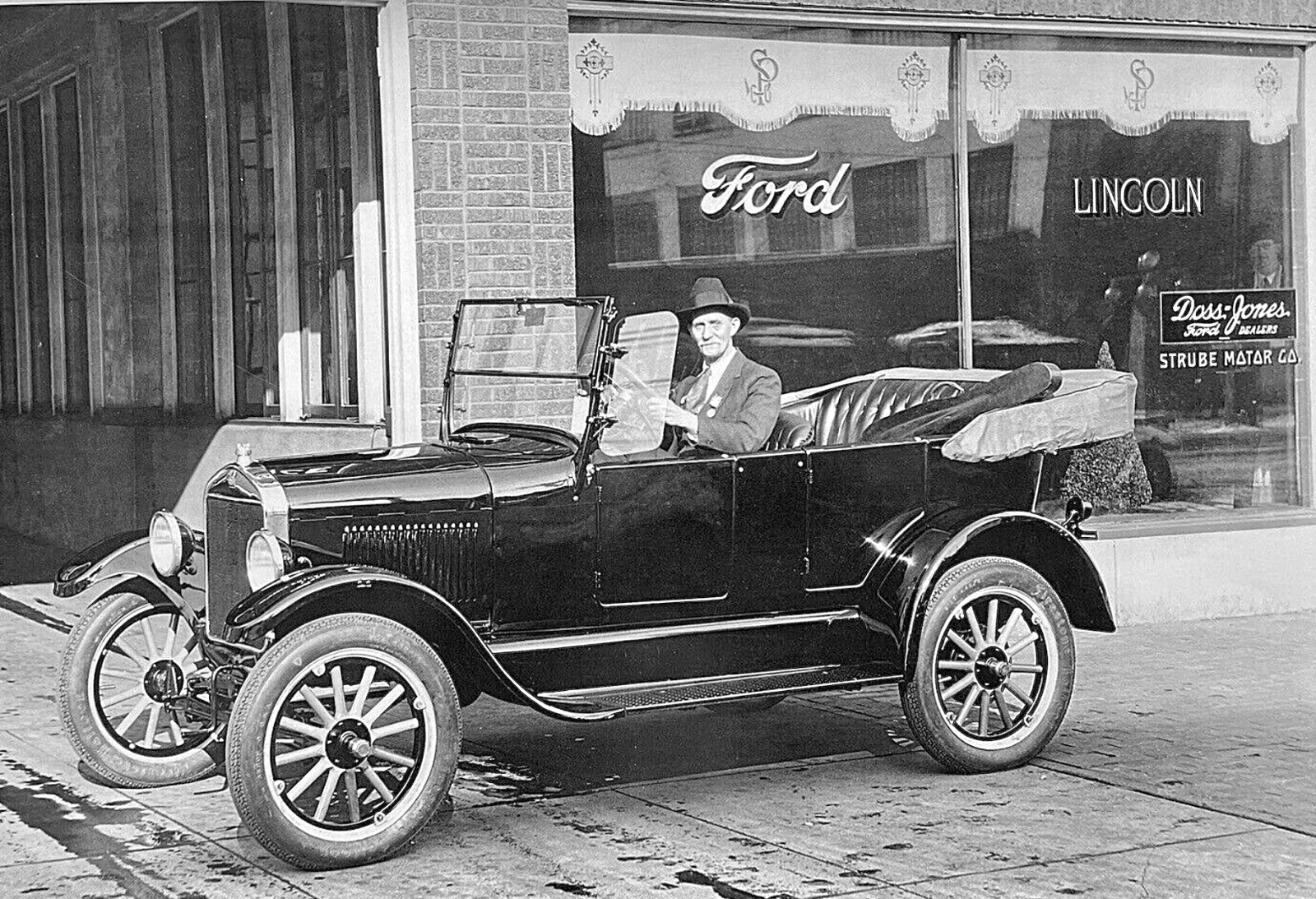 How interesting ! That 1st picture is of an obviously new ‘New and Improved’ outside a dealership with Non Treated wood spokes. And the last picture tells me they lost cowl lamp fonts way back when.