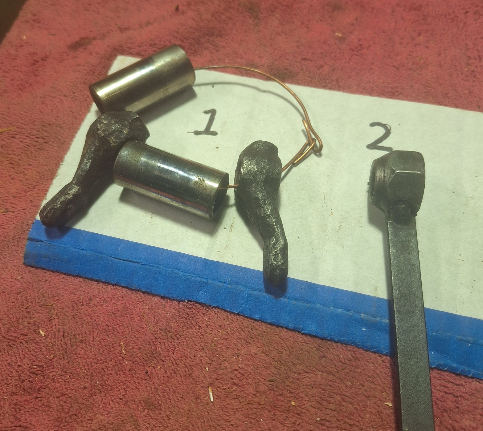 This group holds the original Ford cam nut wrench in place so it does not cam off the nut. When I rebuild an alloy hogshead, this fly cutter allows me to make a land for a lipped oil deal around the outside end of each pedal shaft. It is hand driven on the hex nut on the end. My 12 year old son made no.5. Can you guess it's purpose?