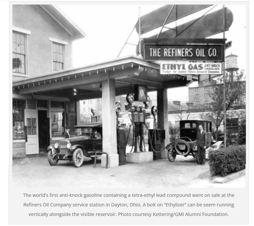 "In 1922, Thomas Midgley and co-workers at the General Motors Research Laboratory in Dayton, Ohio discovered that adding tetraethyl lead to gasoline raised the compression and hence, speed, by eliminating the engine "knock". This allowed for the development of the "mod-ern" automobile produced over the next 50 years.3 General Motors, which had an interlocking directorship with the DuPont Chemical Company, quickly contracted with DuPont and Standard Oil of New Jersey to produce tetraethyl lead. Leaded gasoline was placed on sale in selected markets on February 1, 1923. In 1924, DuPont and General Motors created the Ethyl Corporation to market and produce its final product.