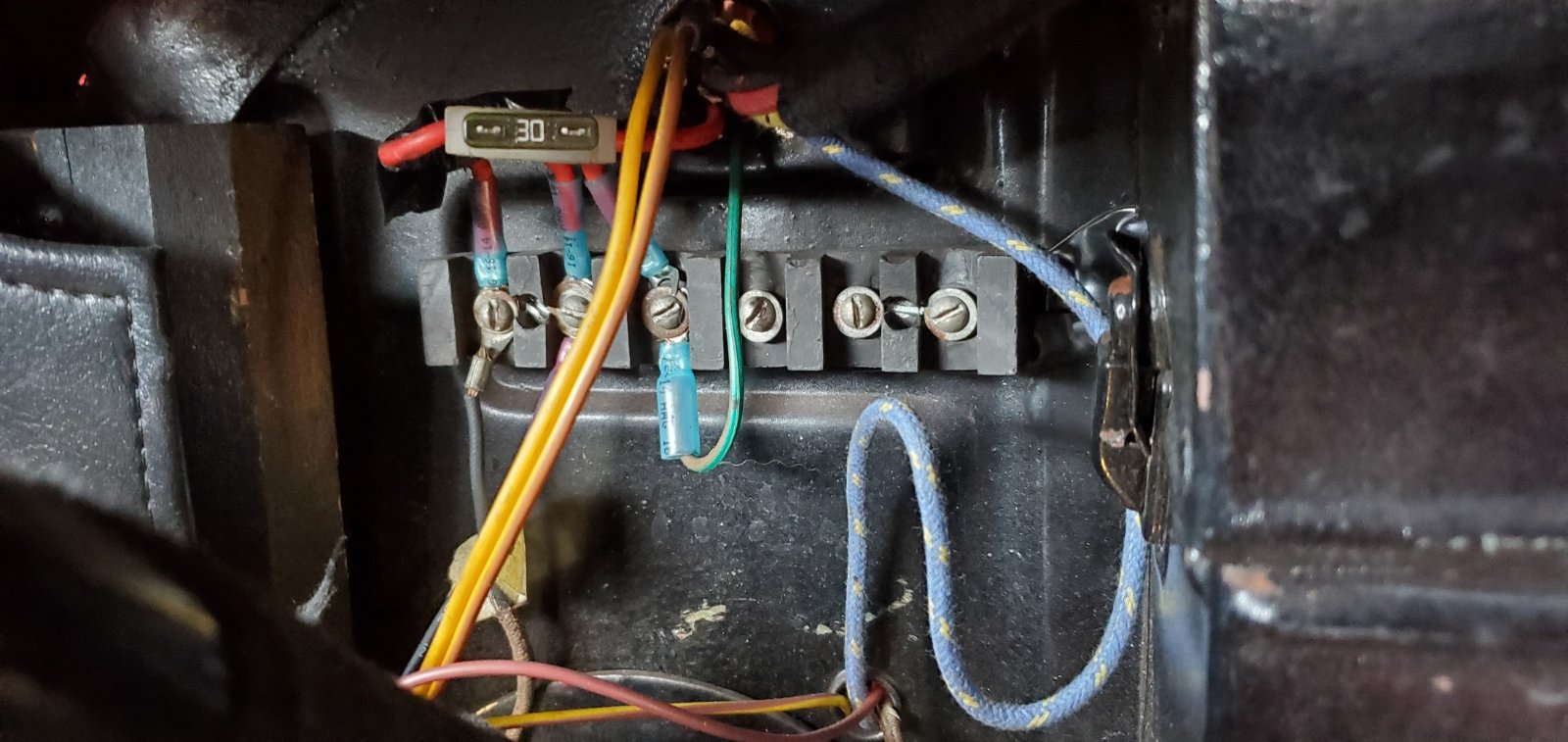 Here is my 2nd terminal block, forgot I had 30amp fuse in it, need to change that. Ran a line off the battery to the fuse and then split it 3x for the acessories. I'm still using 6v.